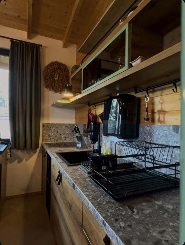 Кухнята е напълно оборудвана с всичко необходимо: фурна, котлони, микровълнова печка, хладилник, пералня, кафе машина и кана за чай, както и нужната посуда.